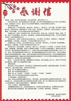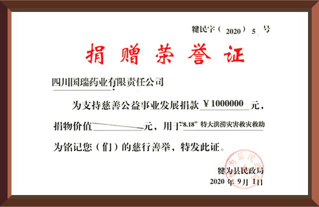 2020年8月18日,四川省犍为县遭遇百年未遇特大洪涝灾害,北京胡云绿色清洁科技有限公司集团国瑞药业向犍为县灾区捐赠现金100万元。